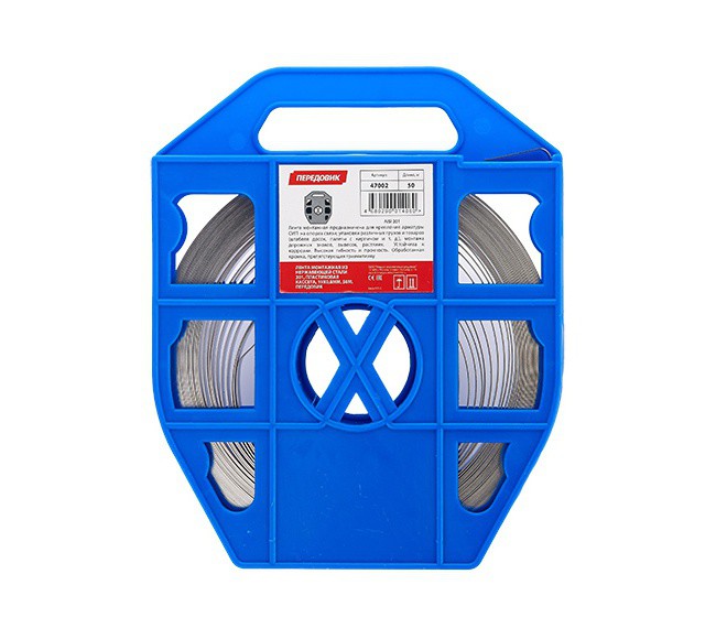 БАНДАЖНАЯ ЛЕНТА ИЗ НЕРЖАВЕЮЩЕЙ СТАЛИ 304, ПЛАСТИКОВАЯ КАССЕТА, 19Х0,8ММ, 50М. тм ПЕРЕДОВИК (арт.47003)